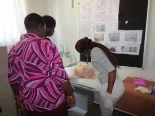 Maggie Zgambo, Emmaculate Kawawa, and Mirrium Malowera are all laywomen trained by Lily. Here they are practicing breast examinations for cancer symptoms.