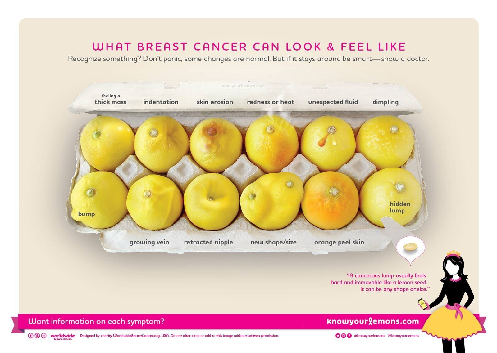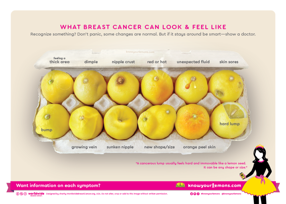 We included the area that you should be feeling in a self-exam (armpit -> collarbone -> ribcage) on The Mayor in the corner, along with a summary of the 3 lumps you might feel: