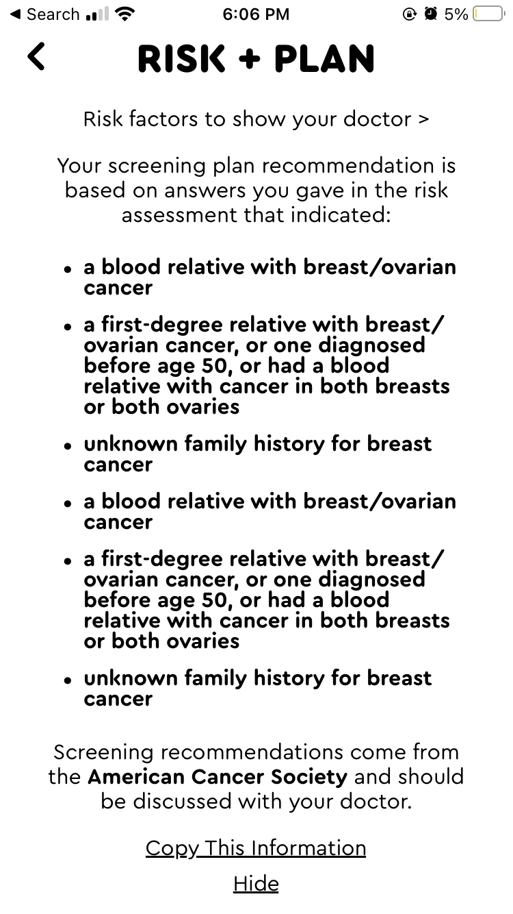 The Know Your Lemons app creates a screening plan for you based on the results of your personal risk assessment. Bring your screening guide that includes your risk factors to your doctor to discuss.