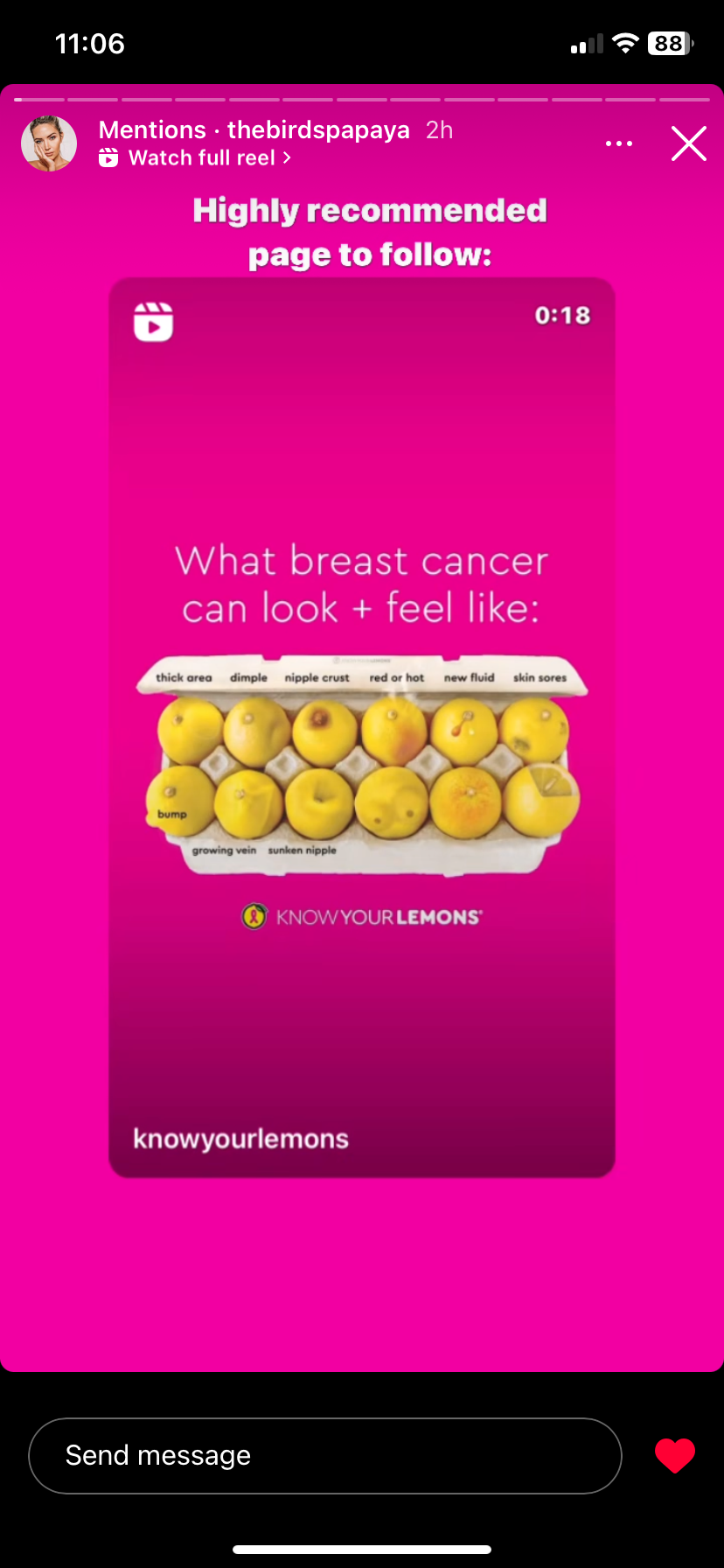 Little did she know that this short journey that she took in taking care of her health would have a big impact on those around her. As she was waiting for her results she started researching different breast cancer charities and groups and "bam!" came across Know Your Lemons. She gave us a follow and re-shared our 12 signs image to her stories.