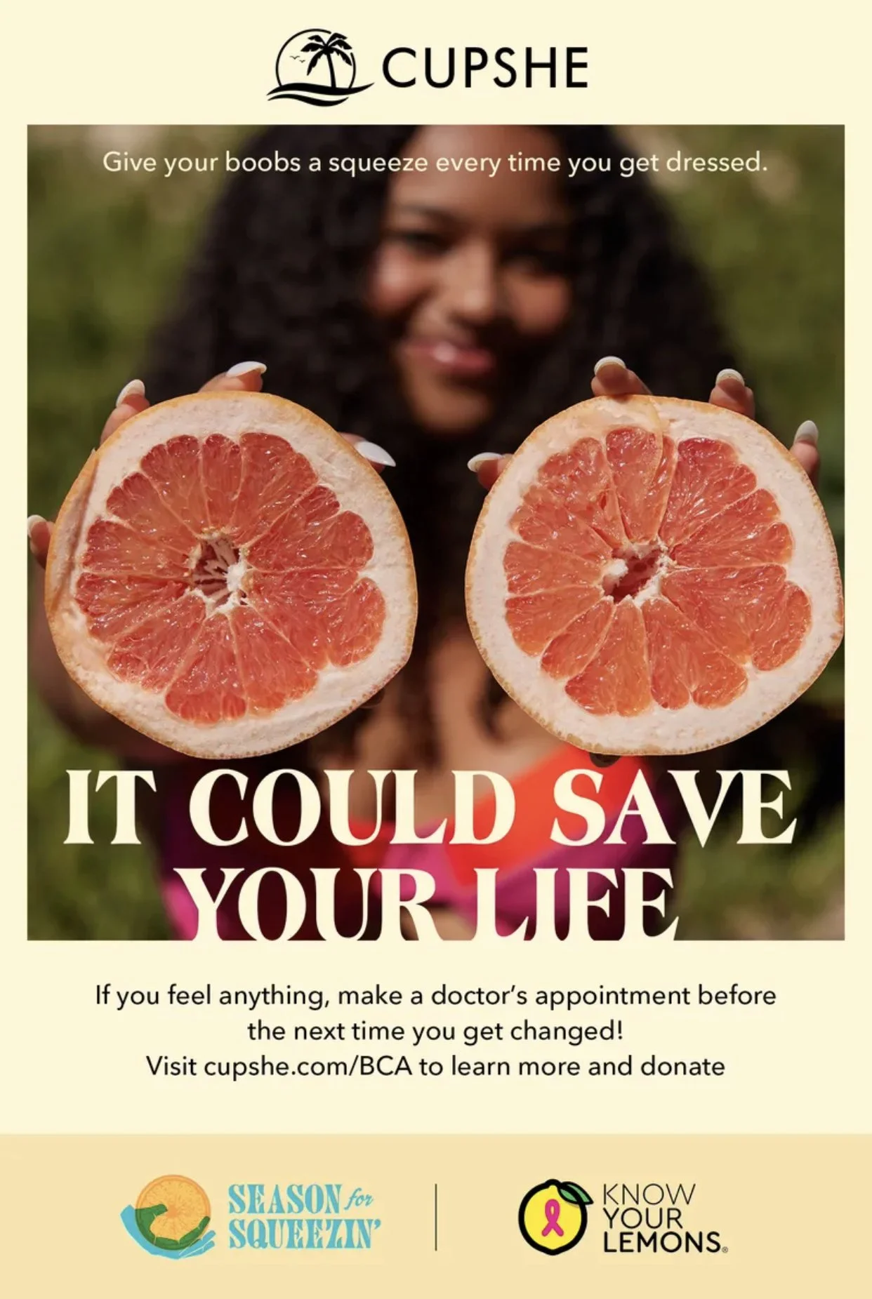 Save the lives of your customers and employees with Know Your Lemons lifesaving education for early detection of breast cancer. AND you can feel really good doing it because you are also raising funds to support our education campaigns to improve breast cancer outcomes in 70+ countries. Our partner, Cupshe, made a HUGE splash last year, raising over $8,000 in just one short month. Because of the support from Cupshe and their customers, we were able to translate our lifesaving breast health into Spanish helping us to reach millions more women worldwide! Learn more about our work together here.